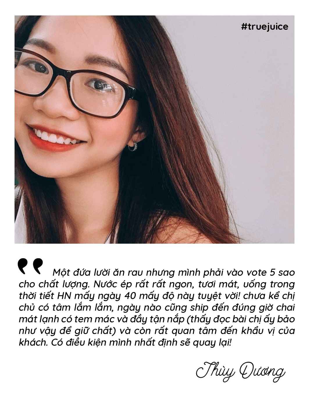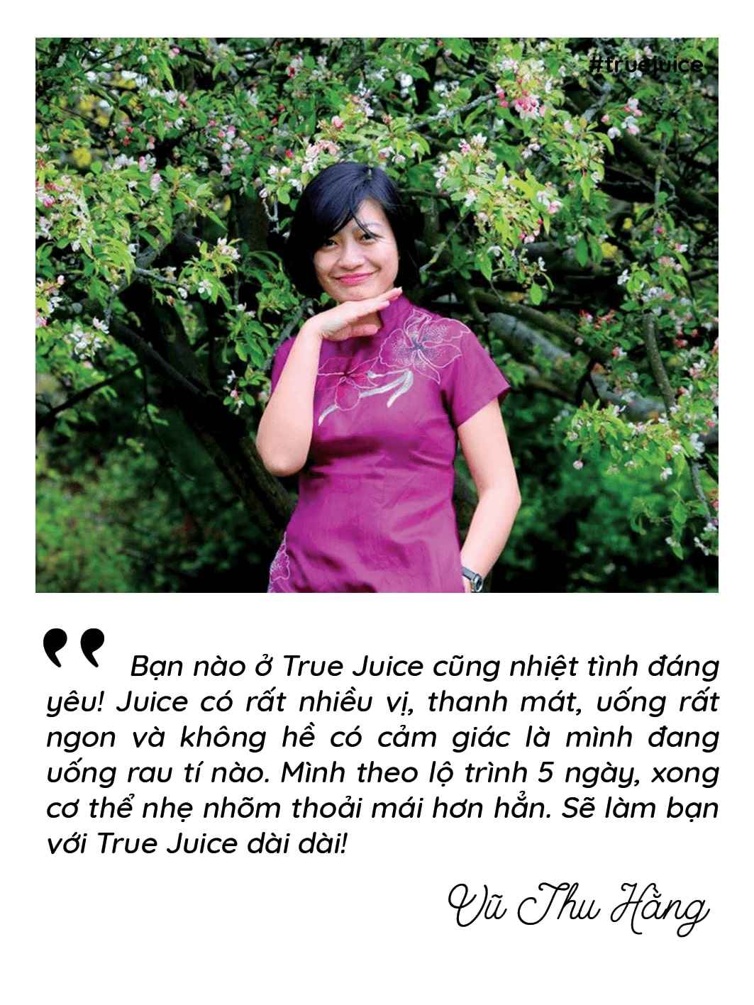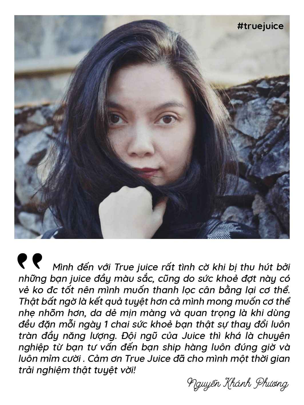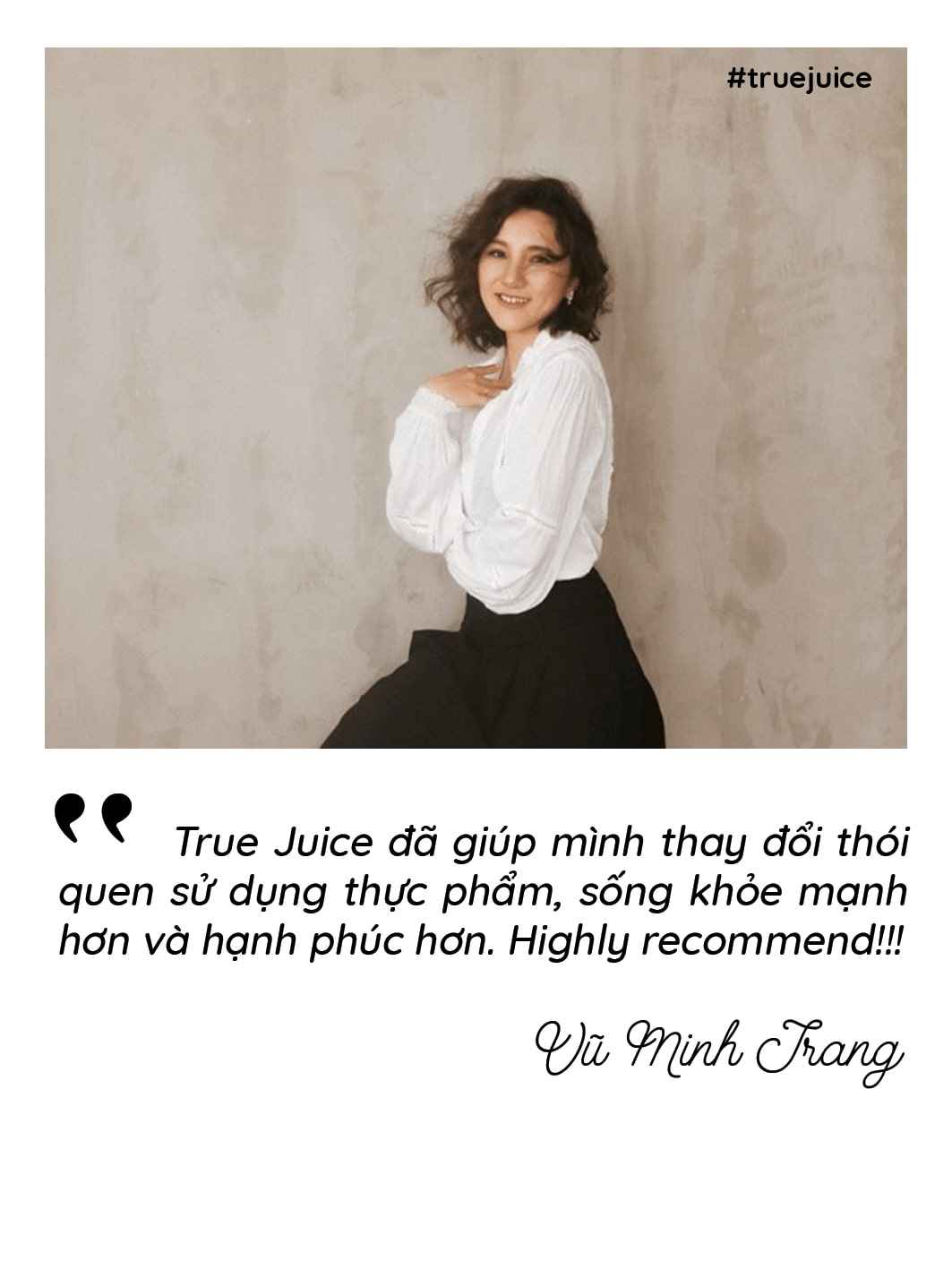 Đồ uống của True Juice luôn được làm tươi sống với các chỉ tiêu khắt khe về chất lượng, được ép với công nghệ ép lạnh hiện đại để giữ được tối đa dinh dưỡng của rau củ quả. Mỗi chai 295ml ép từ 0.6 ~ 1kg rau củ tươi sống nguyên chất 100% canh tác hữu cơ, có chứng nhận an toàn đảm bảo cho sức khỏe người tiêu dùng từ các nhà cung cấp uy tín, đáng tin cậy.